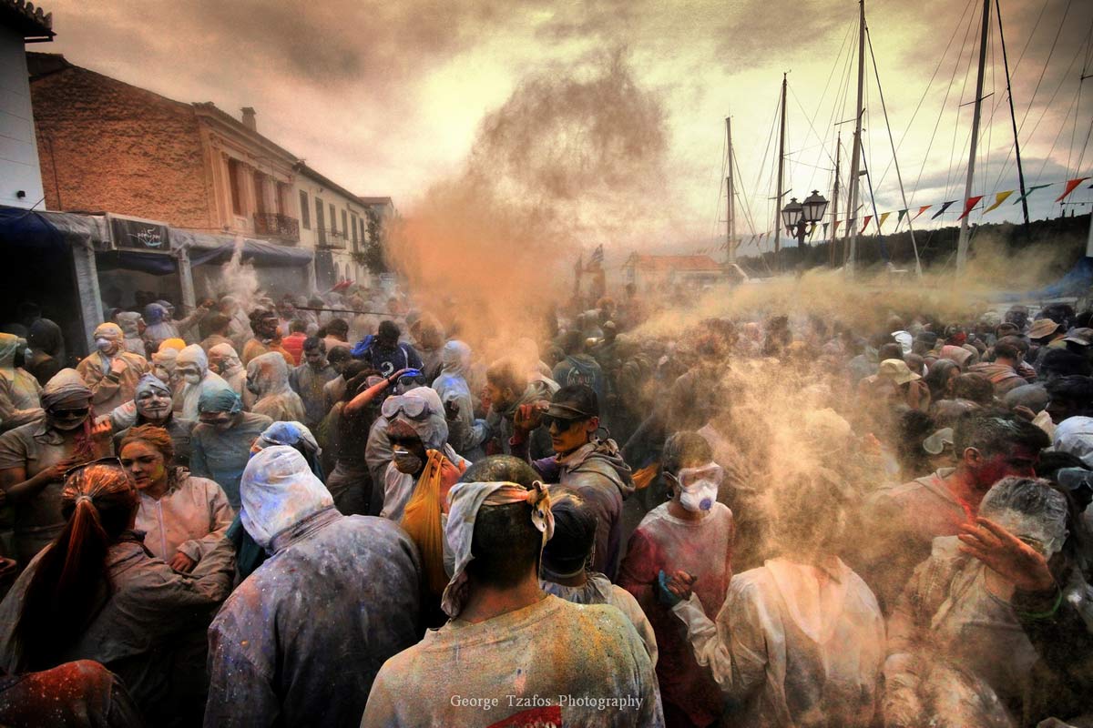 Η τάση να χρησιμοποιούμε τα τρόφιμα ή άλλους πόρους ως μέσο «διασκεδάσεως» δεν είναι μόνο ξενικό φαινόμενο. Στην Ελλάδα π.χ., το έθιμο των αλευρο-μουτζουρωμάτων στο Γαλαξείδι προσφέρει ένα ανάλογο παράδειγμα, όπου οι συμμετέχοντες αλληλο-καλύπτονται με αλεύρι, προκειμένου να συντηρήσουν ένα παλαιό έθιμο. Πρόκειται για μια «εορτή» που, αν και προγενέστερη, έλαβε μεγάλες διαστάσεις μετά το έτος 1840, καθώς οι ναυτικοί του Γαλαξειδίου αποχαιρετούσαν με τον τρόπο αυτόν τις οικογένειές τους.