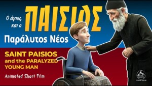 Ο άγιος Παΐσιος σηκώνει τον νέο στην αγκαλιά του και τον βοηθά να κάνει λίγα βήματα με πίστη, προσευχόμενος με δάκρυα και δείχνοντας ότι τίποτε δεν είναι αδύνατο για τον Θεό.